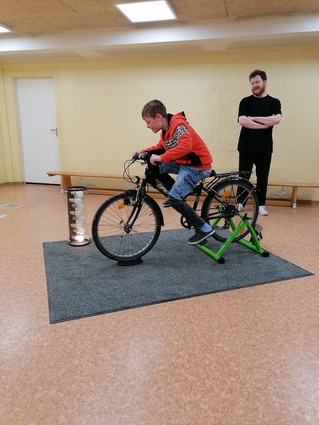 Wir liehen uns den Ökotrainer aus und produzierten unseren eigenen Strom. Dieser wurde an einer Lampenkonstellation sichtbar gemacht.