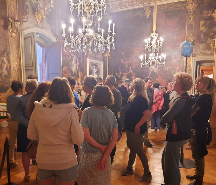 Startpunkt war der Haupteingang des Schlosses Moritzburg um 9:45 Uhr, wo um 10 Uhr eine einstündige Führung durch die prachtvollen Räume des Barockschlosses begann. In eindrucksvoller Atmosphäre konnten wir Spannendes über das Leben am Hofe Augusts des Starken erfahren und die kunstvoll gestalteten Räume – wie auf dem Bild zu sehen – aus nächster Nähe erleben.