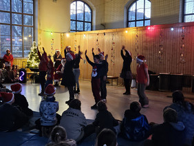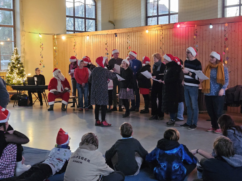 Die Schülerinnen und Schüler zeigten ein tolles Programm, der Lehrerchor brachte uns mit weihnachtlichen Liedern in Feststimmung – und dann kam das Highlight: der Weihnachtsmann und unser ganz besonderer Tannenbaum! Beide sorgten für viele Lacher, staunende Kinderaugen und das ein oder andere Foto.
