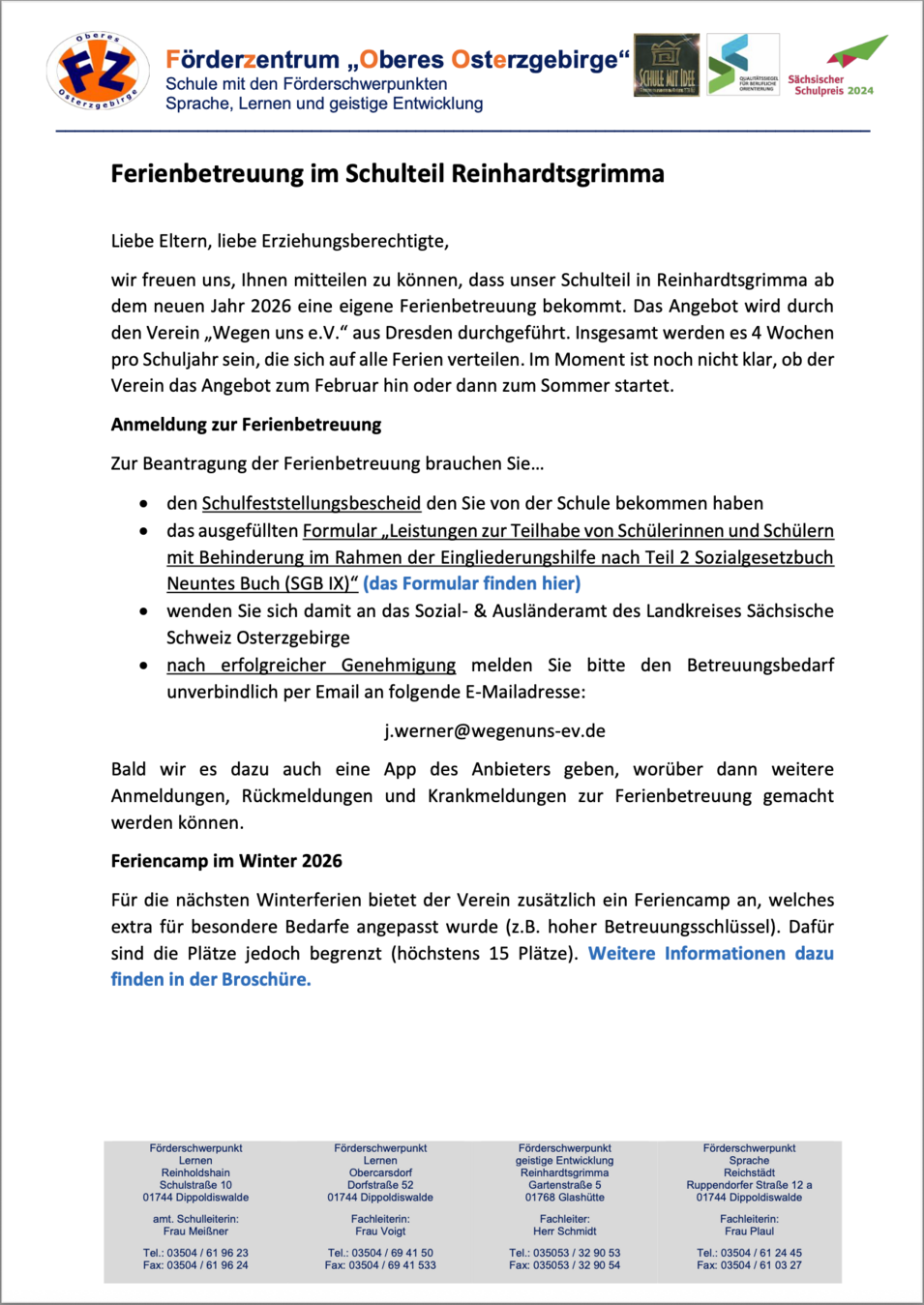 im Namen des Fördervereins und der Förderschule Reinhardtsgrimma