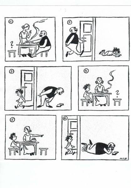 Der Junge ging gehorsam in die Küche. Doch jetzt fehlte der Vater. „Holst du mal bitte deinen Vater!“, sagte die Mutter zum Sohn. Bruno suchte ihn und fand ihn sein Buch lesend. Endlich gingen sie beide in die Küche. Die Mutter war ganz schön böse, weil mittlerweile das Essen kalt war.