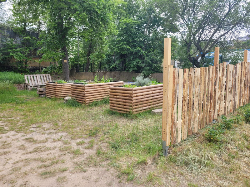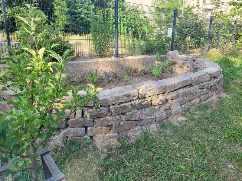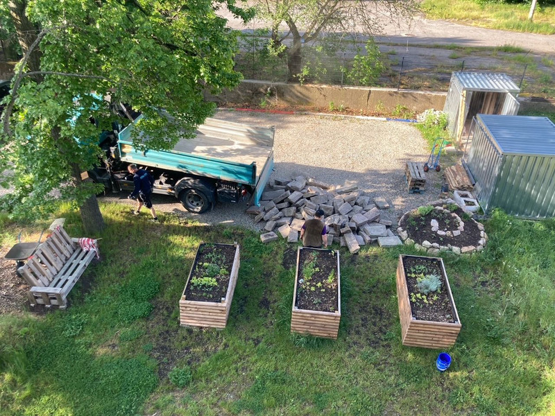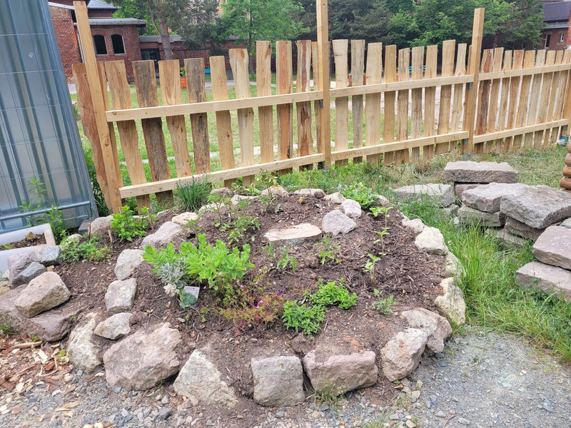- die Kräuterspirale und die Hochbeete sind schon bepflanzt