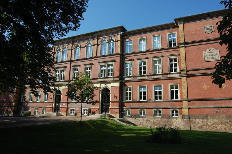 1888 fasst der Schulvorstand der Gemeinde Altchemnitz den Beschluss, ein neues Schulgebäude zu errichten. Auf dem Gelände des abgerissenen, weil baufälligen Gemeindegutes, wird 1888 der Grundstein gelegt. Der Schulvorstand führt eine "Direktorprobe" mit 3 Bewerbern durch. Herrn Carl Friedrich Meier (Bildmitte) aus Lößnitz befindet der Schulvorstand schließlich für würdig. Er heißt gemeinsam mit 10 Lehrern die ersten Schüler willkommen. 1899, Altchemnitz gehört inzwischen zur Stadt Chemnitz, wird die Schule durch einen südlichen Flügelanbau erweitert. In den Jahren 1907 bis 1909 erhält die Schule schließlich ihr jetziges Aussehen.