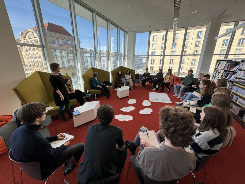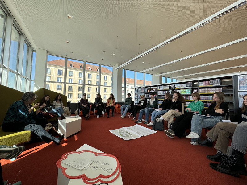 Schülerinnen und Schüler unseres Gymnasiums haben die Möglichkeit genutzt, um mit der Dresdner Umweltbürgermeisterin, Frau Eva Jähnigen, in eine Diskussion zu kommen. Im Mittelpunkt des Gespräches stand die geplante Begrünung, Beschattung und Entsieglung unseres Schulhofes.