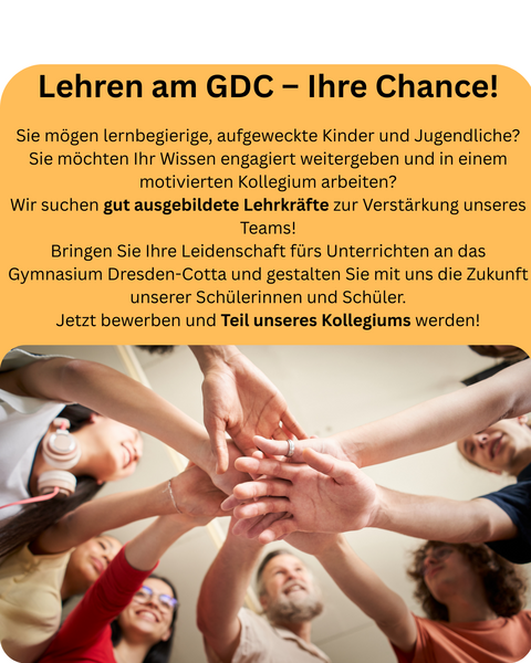 Sind Sie eine ausgebildete Lehrkraft auf der Suche nach einer Schule, in der alle Fachrichtungen gewertschätzt werden? Dann sind Sie bei uns genau richtig! Am Gymnasium Dresden-Cotta bieten wir eine moderne Ausstattung, flexible Lernräume und ein offenes, fröhliches Kollegium, das stets auf der Suche nach engagierter Unterstützung durch neue Lehrkräfte ist.
