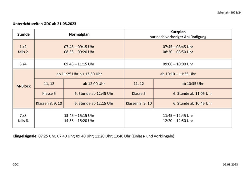 Ab dem Schuljahr 2023/24 wird am GDC grundsätzlich im Blockunterricht in den Fächern mit zwei bzw. vier Wochenstunden gelernt.