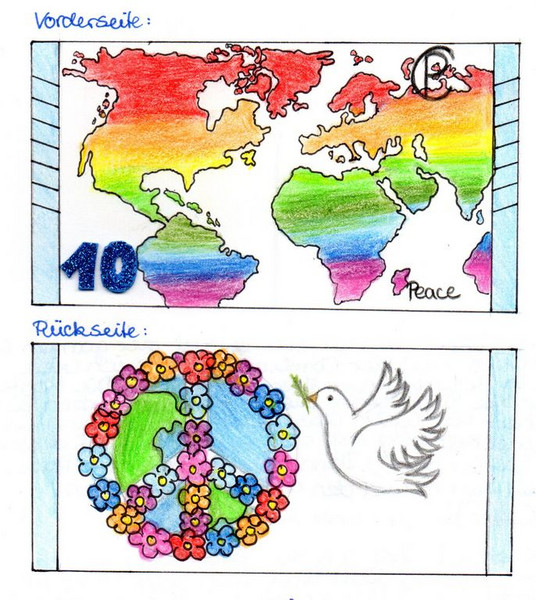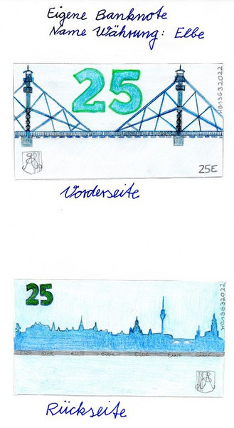 Nach einer Auseinandersetzung mit der deutschen Währungsgeschichte und den Besonderheiten des Euro haben die Lernenden selbst einmal versucht Geldscheine zu entwerfen, die den Anforderungen an Banknoten, Identifikation der Nutzer und Fälschungsschutz, entsprechen.