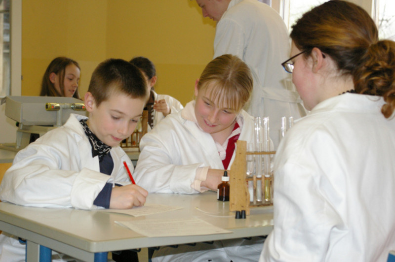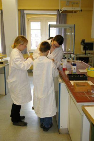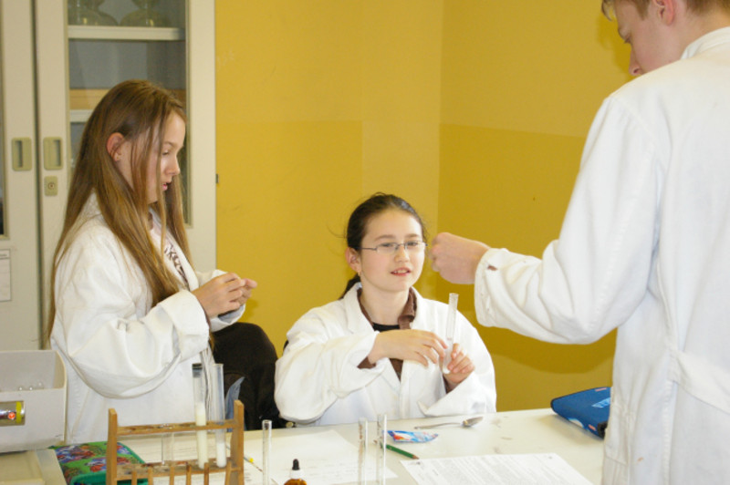 Zur Teilnahme an der zweiten Wettbewerbsrunde des Experimentalwettbewerbs für die Klassen 5 bis 8 trafen sich am 17.4.08 fünf besonders naturwissenschaftlich interessierte Schüler aus der Klasse 5/1. Fast 2 Stunden lang untersuchten Becky, Lia, Wiebke, Michelle und Bruno die Zusammensetzung von Milch, Zucker, Vanillinzucker und Sahnesteif, fertigten Kältemischungen aus Eis und Kochsalz an (mit denen immerhin Temperaturen von -20°C erzielt wurden) und mixten die Zutaten von Speiseeis miteinander. Fachkundig angeleitet wurden sie dabei von Stephanie, Philipp und Nico aus der 10/4 sowie Frau Förster und Frau Reiche.