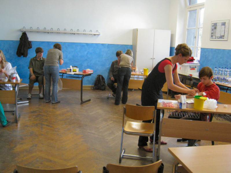 Und am Nachmittag sprang glücklicherweise Frau Hoffmann spontan mit ein, unser Ärztinnenteam von Frau Vogt und Frau Wagner zu unterstützen, denn sonst wären die Wartezeiten bei der Blutentnahme wohl noch länger gewesen! Mit dem Ansturm in der ersten Stunde hatten wir dann doch nicht gerechnet. Und auch im Datenerfassungszimmer konnte der Lk Chemie 12 eine zusätzliche Bank einrichten, um das Ausfüllen der Fragebögen zügiger abzuwickeln.
