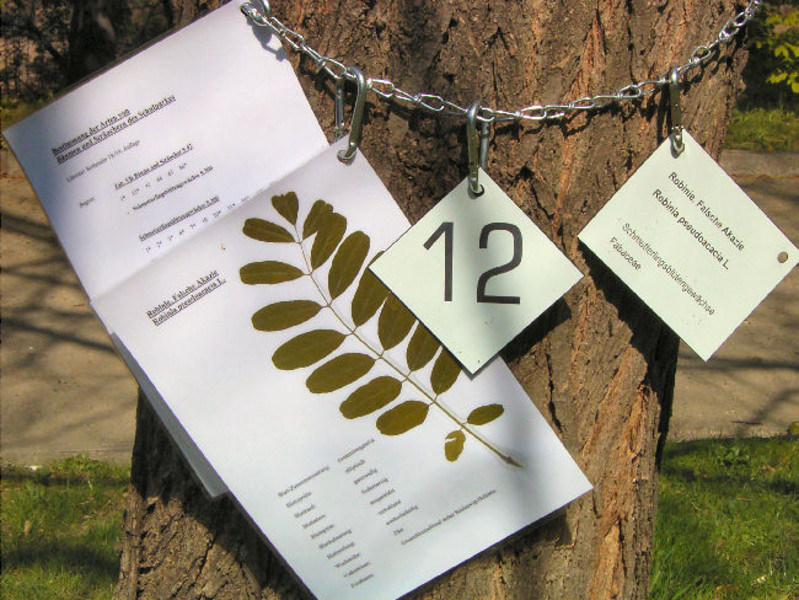 Mit den Geldern konnten wir diese Schilder mit den Nummern und exakten Bezeichnungen der Baumarten herstellen lassen. Weiterhin erarbeiteten wir die Tabellen, die auf dem Foto zu sehen sind, mit typischen Merkmalen der Baumarten und Bestimmungstabellen für Schüler unterschiedlicher Klassen.