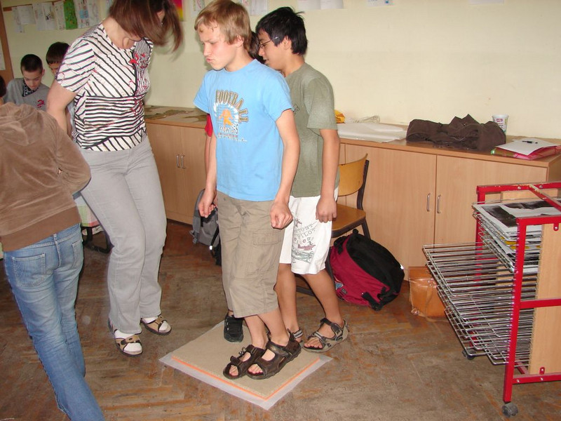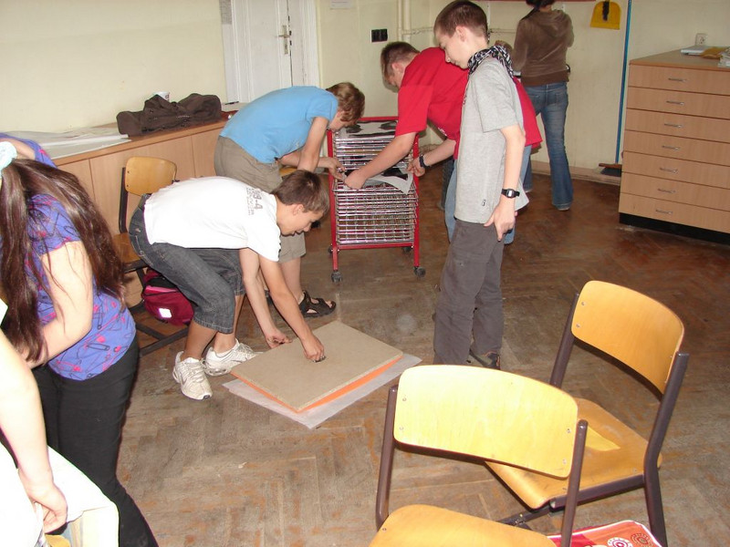 Ohne eine Druckpresse zu drucken erfordert Kreativität. Man benötigt Gewichte, die man leicht transportieren kann und die in Kombination dennoch schwer genug sind, um ausreichend Druck auf den Druckstock zu bringen. Und wie lautet die clevere Antwort der 6.1: "Wir nehmen am besten unsere Körper!" Jawohl.