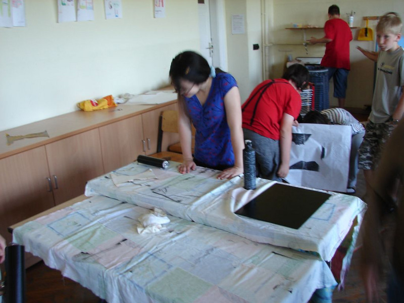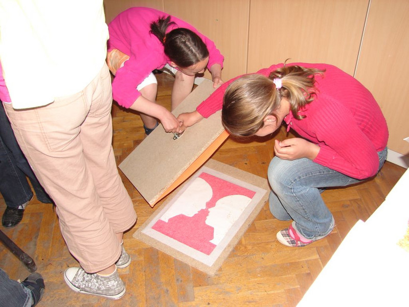 Beim Drucken ihrer Schattenrisse im Schablonendruckverfahren brachten die Schüler in Gruppen von bis zu fünf Personen ungefähr 200kg und jede Menge Spaß auf unsere "Schülerdruckpresse". Gleichgewicht und Teamgeist sind da ebenso wichtig wie gute Vorbereitung des Druckstocks und sauberes Arbeiten. Einige Ergebnisse können zurzeit in der neuen Bildergalerie vor der Aula bewundert werden.