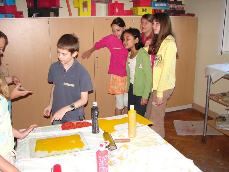 • Kl. 5:  Fadendruck – der Faden kringelt sich  zu seltsamen Wesen und in der Vitrine: Ägyptische Flachreliefs