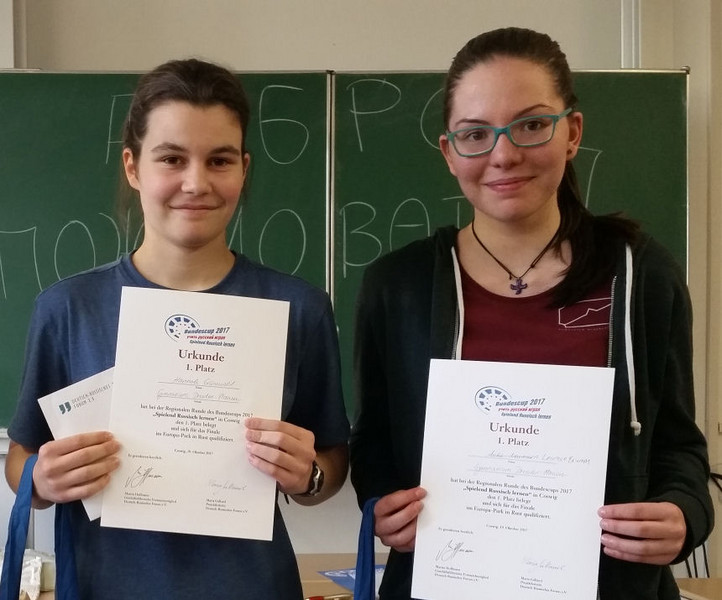 Bereits zum 9. Mal beteiligten wir uns am Bundescup „Spielend Russisch lernen“. Bei diesem Wettbewerb wird in Zweiermannschaften gespielt.Hannah Grünewald (inzwischen leider nicht mehr) Russischlernende und Leonore Brumm als Nicht-Russisch-Könner, beide Klasse 11, hatten sich als Sieger unserer Schulrunde im Juni für die Regionalrunde am 19.10. in Coswig qualifiziert, an der zwölf weitere Teams aus Sachsen und Brandenburg teilnahmen.Zu unserer großen Überraschung konnten sich die beiden Mädchen nach mehreren spannenden Spielrunden gegen die starke Konkurrenz durchsetzen und die Regionalrunde gewinnen.
