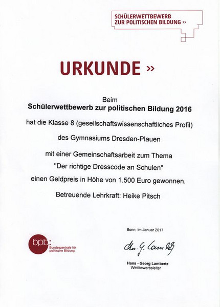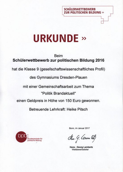 Der Beitrag von Schülern der Klassenstufe 9 in der Rubrik "Politik Brandaktuell" über die (damals noch nicht entschiedene) Präsidentschaft Donald Trumps wurde mit einem Geldpreis von 150 € prämiert.
