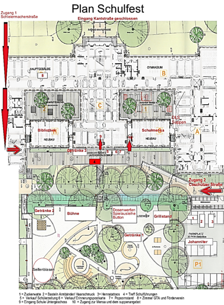 Die Johanniter sind mit beim Schulfest und informieren über erste Hilfe und das für Lernende ab Klasse 7 geplante Angebot, eine Schulsanitätsgruppe ins Leben zu rufen. Außerdem findet ihr einen Stand zum Armbänderbasteln, einen Stand für Henna-Tattoos (dafür benötigt ihr die Erlaubnis der Eltern), einen Stand, der die wieder neu entstandene Schülerzeitung verkauft, einen Stand der eine Postkarte zum Schuljubiläum verkauft, ihr könnt Wikingerschach ausleihen, Tischtennis spielen, Stelzen ausleihen, euch beim Zielwerfen und beim Dosenwerfen ausprobieren und Schach spielen. Für die kleinen durch die Klassen gewählten Teams der 5. und 6. Klassen gibt es eine Rallye unter dem Motto „Kennst du unsere Schule?“.  Die Klasse 8/5 will übrigens mit der Produktion von Riesenseifenblasen besonders jüngere Gäste erfreuen.