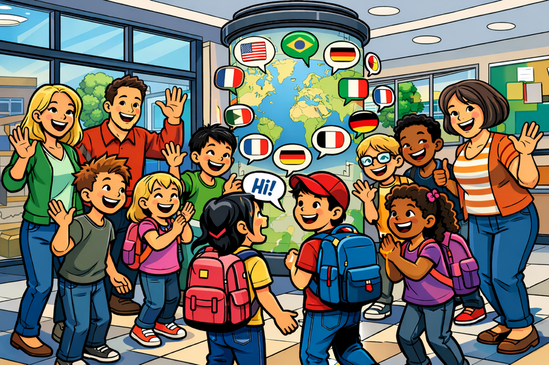 Deshalb begrüßen wir seit Januar 2026 jeden Mittwoch die Kinder unserer Schule in einer anderen Sprache. An der Litfaßsäule im Foyer erhalten die Kinder zusätzlich spannende Informationen zur jeweils vorgestellten Sprache.