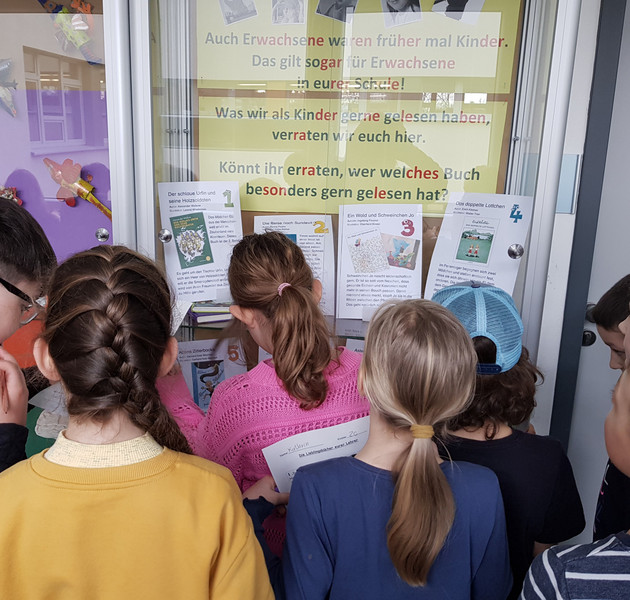 Die Kinder waren aufgefordert, zu erraten, welches Buch wohl zu welchem Erwachsenen gehörte. Es herrschte viel Betrieb und gab witzige Diskussionen vor der Vitrine. 96 Kinder nahmen an den Ratespiel teil. Nach der Auflösung bekamen die ausgelosten Gewinner natürlich Bücher als Preise.