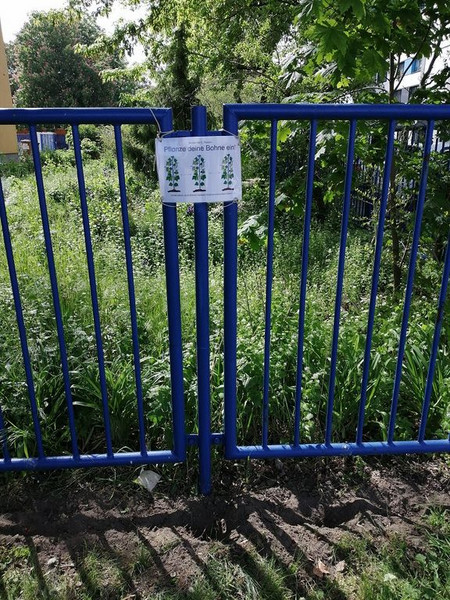 Dort haben die Kinder der Notbetreuung den Boden für die Bohnen vorbereitet. Einige Löcher sind auch gegraben.Du darfst aber auch eine Schaufel mitbringen und selbst graben.
