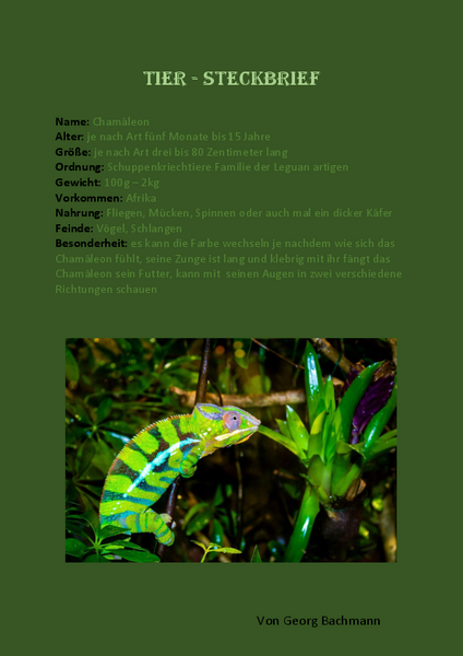Georg aus der 2b hat mit Hilfe seiner Schwester einen Steckbrief zum Chamäleon erstellt
