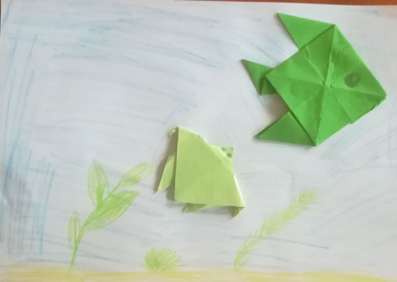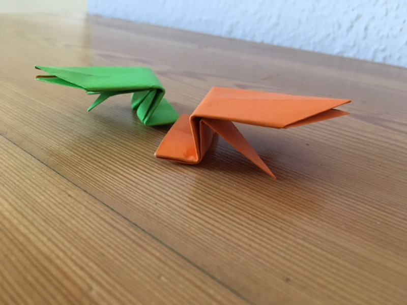 Frau Korec hat Frösche gefaltet, die richtig springen können.