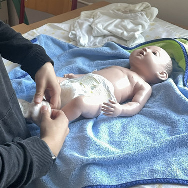 Mit viel Freude und Geschick durften die Schülerinnen und Schüler anschließend selbst aktiv werden: Babypuppen wurden vorsichtig gewickelt und liebevoll angezogen. Dabei zeigte sich schnell, dass dies gar nicht so einfach ist wie es manchmal aussieht.