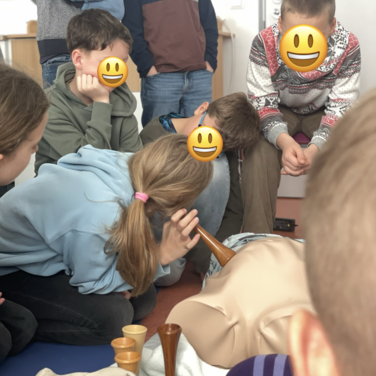 Mit großem Interesse hörten die Kinder mit Hilfe eines Pinard-Rohrs wie sich der Herzschlag eines Babys im Bauch der Mutter anhört: Wie ein gallopierendes Pferd – ein ganz besonderer Moment, der für viel Staunen sorgte. Auch wie sich ein Babybauch anfühlt, konnten sie selbst ausprobieren: Mit einem Babybauchsimulator zum Umschnallen erfuhren die Kinder, wie sich dieses zusätzliche Gewicht im Alltag anfühlt.