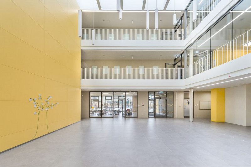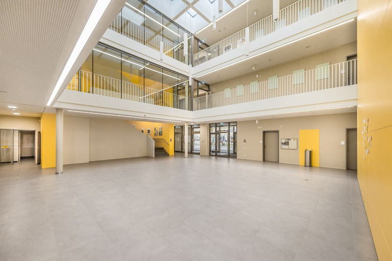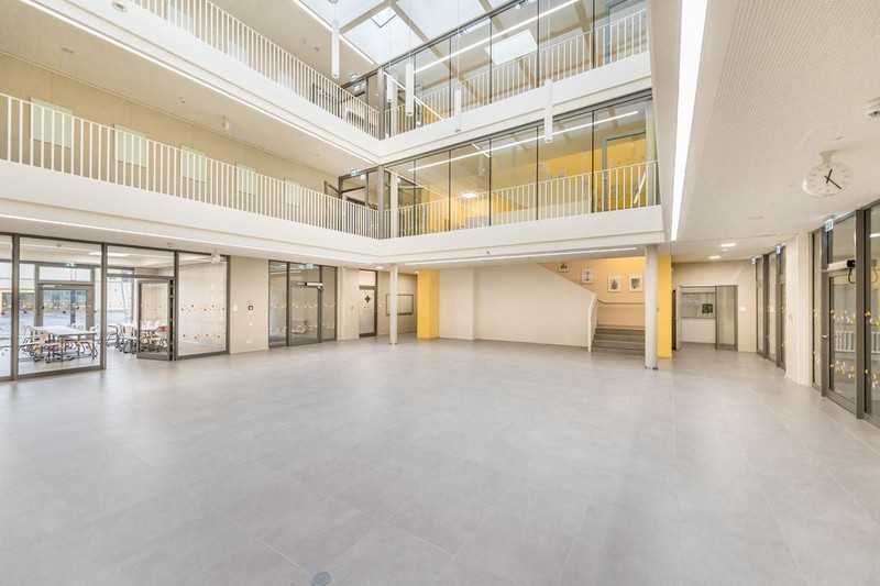 Das Atrium mit Blick in Richtung Schulhof bietet Platz für Veranstaltungen oder als Spielfläche.