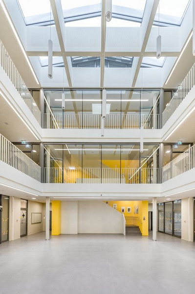 Das gläserne Dach lässt viel Licht in das Schulgebäude.
