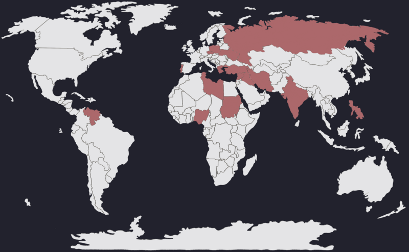 Zurzeit lernen an unserer Schule 43 Kinder mit Migrationshintergrund. Auf der Weltkarte sind die Herkunftsländer der Kinder farblich hervorgehoben.