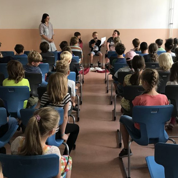 In der Schulwoche vor den Sommerferien fand die Präsentation aller Geschichten-Bücher auf der Lesebühne statt. Dabei waren ganz unterschiedliche Texte zu hören. Manchmal lasen die Kinder ihre eigenen Erzählungen, manchmal die von Freunden aus der Klasse. Oft wurden dabei verschiedene Texte gemixt, was für sehr viel Spaß im Publikum sorgte.