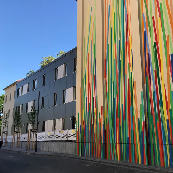 Im Rahmen der Sanierung unseres Schulhauses in der Görlitzer Straße entsteht ein neues Wandbild an der linken Giebelseite. Die Künstlerin Claudia Scheffler realisiert dort im Juli 2019 ihren preisgekrönten Entwurf "Wurzeln & Flügel".