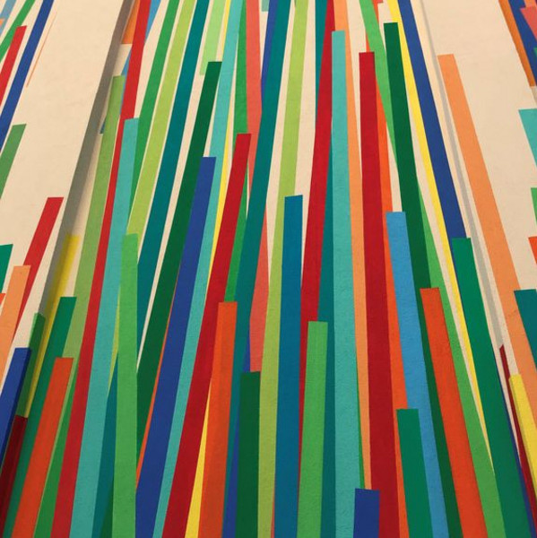 Die Künstlerin schreibt dazu: "Das Bild erzählt vom Suchen und Finden. Es wirkt selbstbewusst, fröhlich, bewegt und ruhig, leicht und standhaft. Von Weitem erlebt man es in seiner Ganzheit. Geht man direkt daran vorbei, taucht man in die farbenfrohe Welt ein und ist mit dem frechen Rot und saftigen Grün auf Augenhöhe. Man mag dabei an ein Feuerwerk denken, an einen Garten, in dem es bunt vor sich hinsprießt. Oder einfach an einen Ort, an dem Kinder sind."