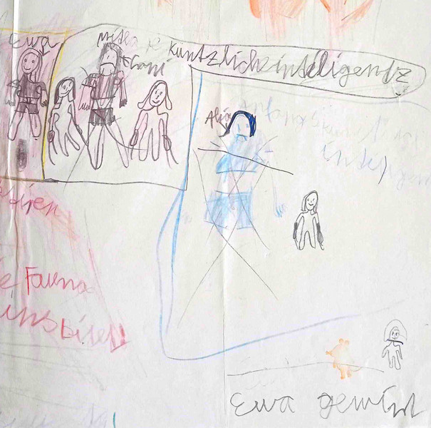 Lottas Geschichte zum Beispiel liest sich wie ein kleiner Schöpfungsbericht. Am Ende kommen zwei Roboter dazu. Einer heißt Ewa. Sie "... hatte von Anfang an die Kontrolle über ihren Körper und ihre Programmierung. Seitdem hilft Ewa den Menschen dabei, die Welt schöner und besser zu machen." - Hier findet ihr Lottas vollständige Geschichte.