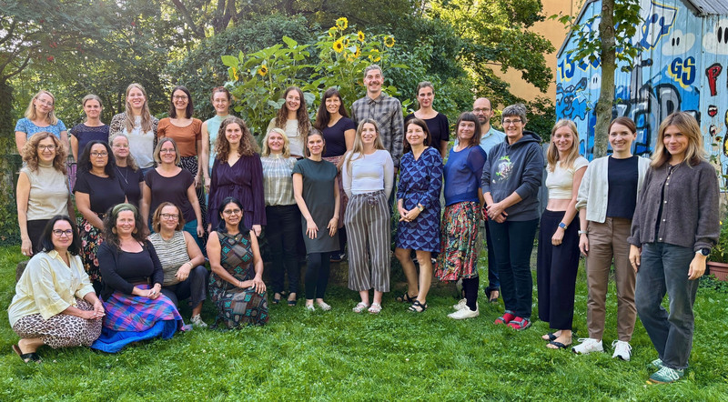 vorn kniend vlnr.: Alina Yaroshenko (Schulassistentin) | Maria Aigner-Orobko (Klassenlehrerin 4b) | Silke Scholz (Klassenlehrerin 3/1) | Mery Yrala de Kaufmann (Schulsozialarbeiterin)