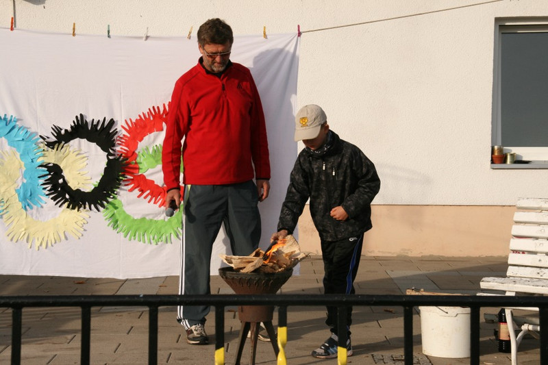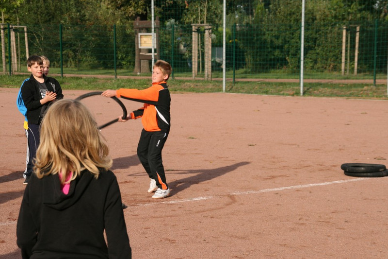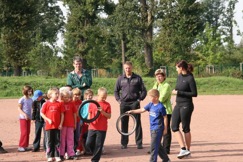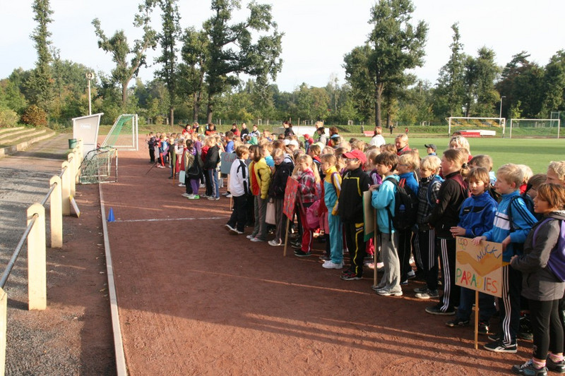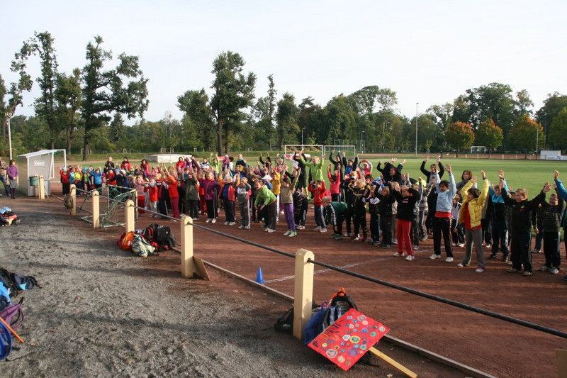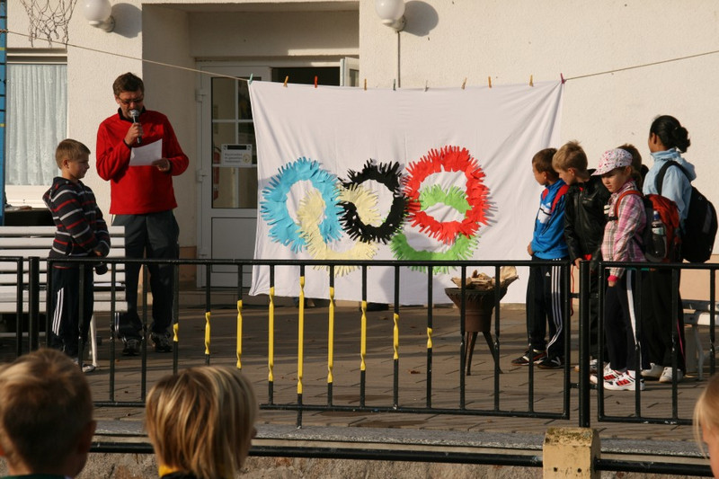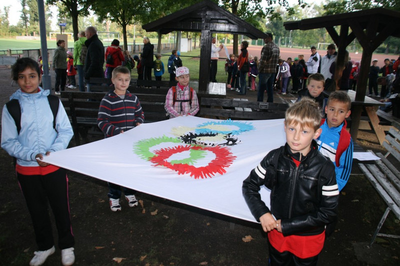 Aufgrund unseres Schuljubiläums „20 Jahre Grundschule“ veranstalteten wir am Freitag, den 21.09.12, unser Sportfest, an dem auch Eltern und Geschwister teilnehmen konnten. Dieser Tag stand ganz im Zeichen von Olympia. Nachdem alle Aufstellung genommen hatten, wurde typisch olympisch, die Fahne herein getragen, das olympische Feuer entzündet sowie der olympische Eid gesprochen. Nun konnte es losgehen. Alle Klassen hatten 10 Stationen zu bewältigen, wobei der Spaß natürlich im Vordergrund stand, denn es ging nicht um Leistung. Nach der Hälfte der Stationen konnten sich die Sportler und Helfer bei Butterbroten (es war auch Tag des Butterbrotes) stärken, um auch die letzten Disziplinen erfolgreich zu beenden. Nachdem alles geschafft war, folgte die Siegerehrung. Dabei konnten alle Mannschaften Urkunden und Preise in Empfang nehmen. Geschafft und zufrieden konnte nun der Heimweg angetreten werden.