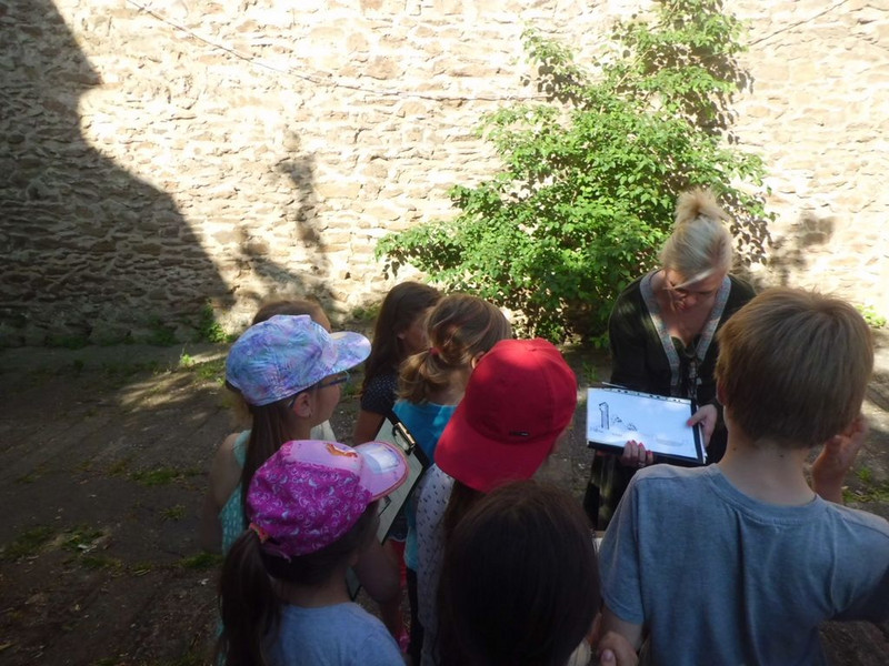Kurz vor Ende unseres Schuljahres gingen wir mit der Stadtführerin Eileen Kretzschmar nochmals auf Entdeckertour durch großenhin. Sie zeigte uns einen Hinterhof in der Naundorfer Straße. Dort steht noch ein Stück von der einstigen Stadtmauer, die an manchen Stellen 12 Meter hoch war.