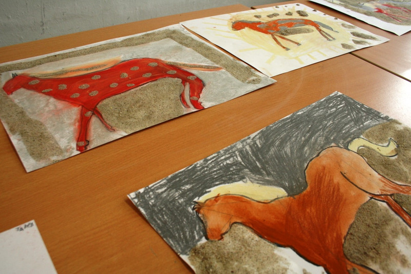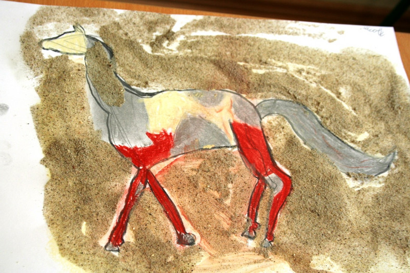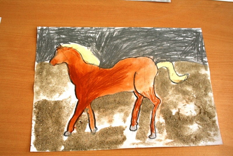 Unsere Pferde sehen alle ganz unterschiedlich aus. Wir haben die Bilder noch mit feinem Sand bestreut. Dann musste Kleber darauf, damit der Sand hält.