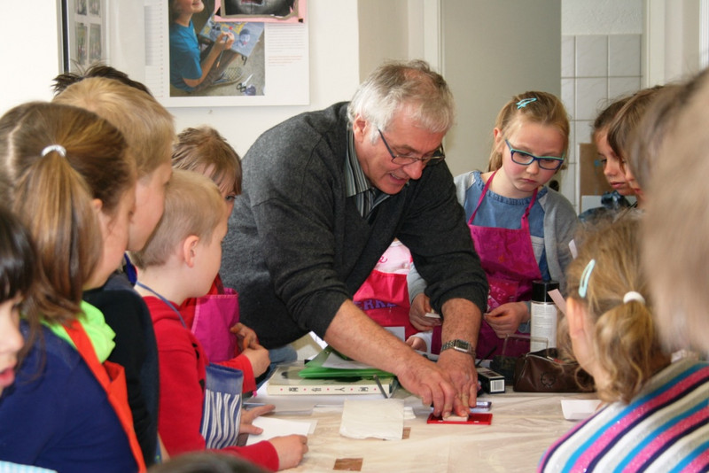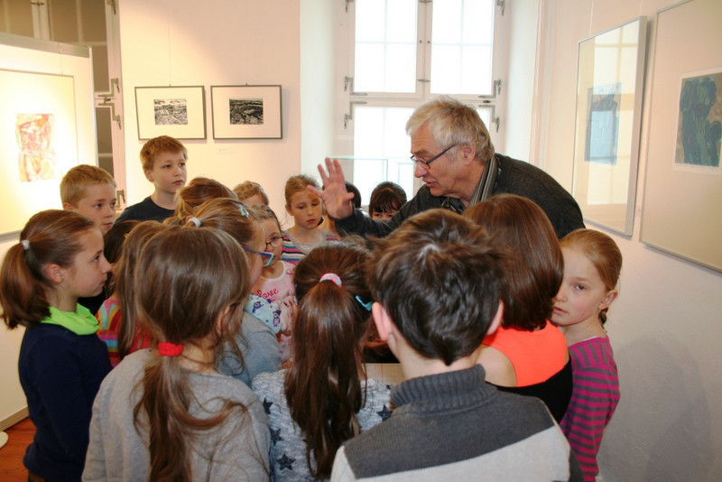 Herr Ferbert erklärte uns die Techniken; erläuterte was z.B. eine Monotypie ist oder welches Bild er mit den Füßen gemalt hat. Wir durften Zettel verteilen und sagten ihm, welche Bilder uns gefallen und welche nicht.