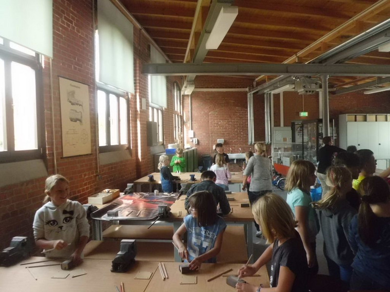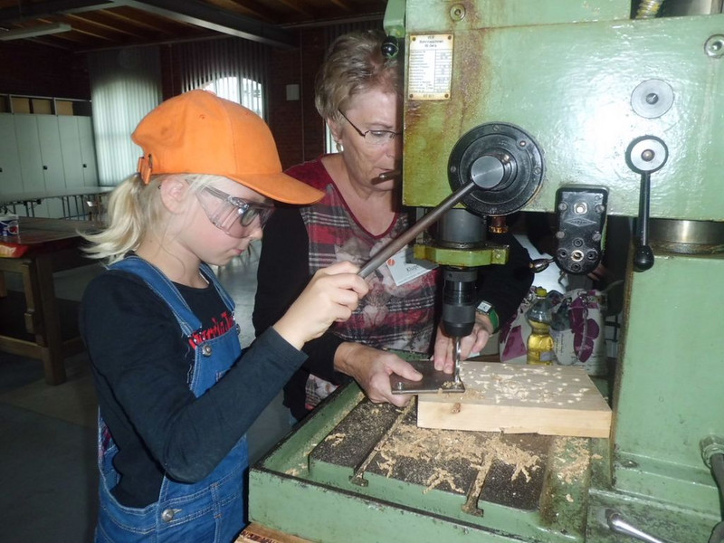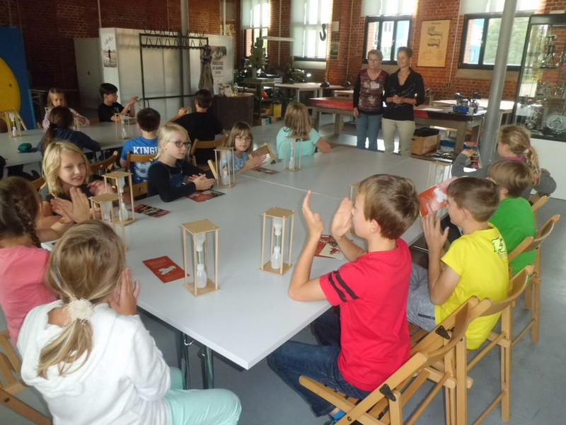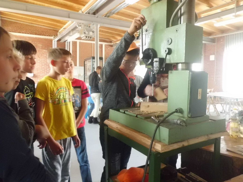 Im Industriemuseum ging es dann richtig handfest zu: wir mussten sogar alles anfassen. Wir bauten uns nämlich eine Sanduhr. Und dazu ging es erstmal an die große Bohrmaschine. Helm war Pflicht!