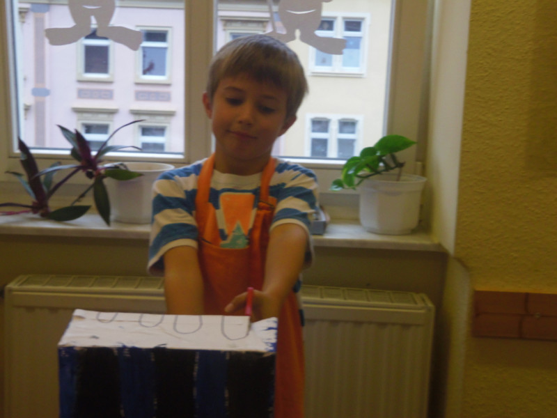 Wir sind 15 Personen insgesamt. Jeden Tag vom 25.9. bis 29.9. treffen wir uns im Kunstraum. Wir haben die Wand angemalt, mit Pinsel und Farbe, damit sie schön werden soll. Am Dienstag haben wir uns Schablonen gemacht. Wir malen Essen und Trinken, Sehenswürdigkeiten, Technik, Comicfiguren und noch vieles an die Wand. Unsere Projektleiterin war Frau Seiler. Am Donnerstag sind wir durch die Stadt gegangen und haben angeschaut welche Graffities schön und welche hässlich sind. Am Freitag sind wir in den Computerraum gegangen und haben ein Bild komponiert.