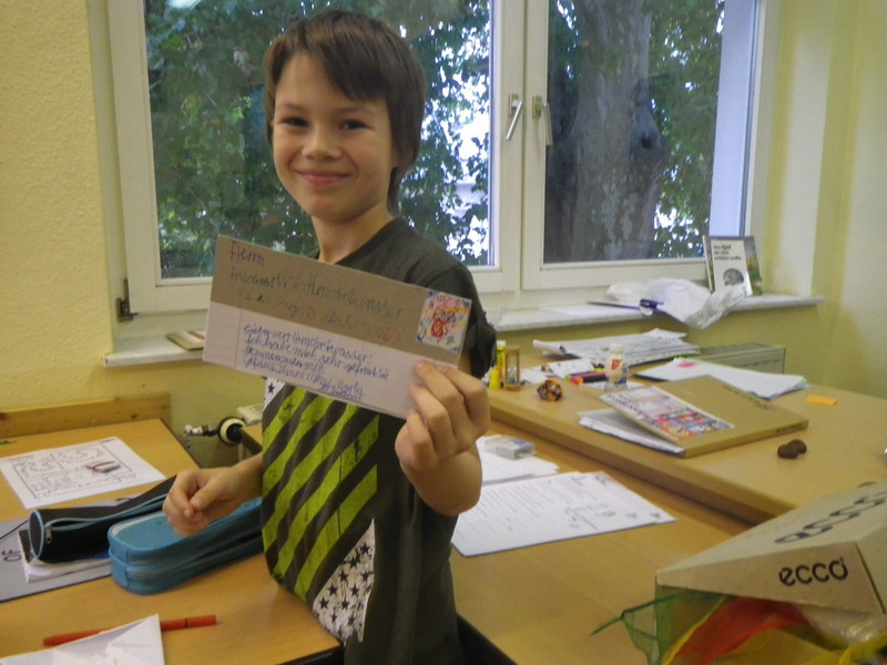 „Die Polizei steht überall. Wir hören schon die laute Musik und v viele Pfiffe. Viele Menschen stehen an einem Ort und demonstrieren. Die Leute, die dafür sind, dass Ausländer bleiben sollen, machen laute Musik, damit sie die NPD nicht hören. Überall sehen wir Plakate von der einen Seite und von der anderen. In der Marienkirche ist ein Gottesdienst für die Ausländer. Es wird viel gebetet und die Orgel spielt. Ich finde, Ausländer sollen bleiben – ohne sie gäbe es vieles nicht!“