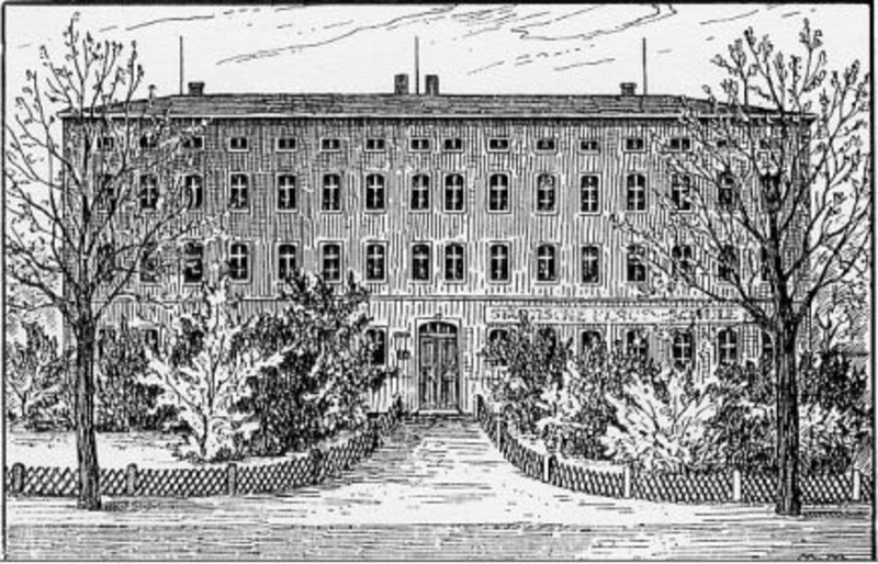 · 1858 Bau des Schulgebäudes als Bezirksarmenhaus im Bereich des ehemaligen Festungszwingers