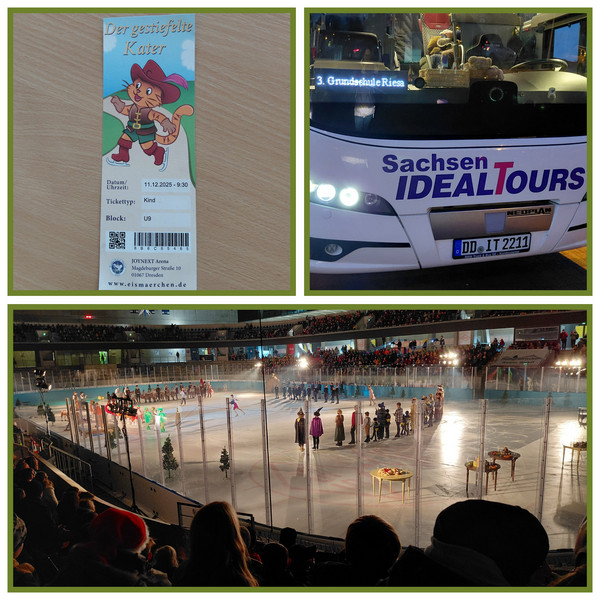 So war es in unserer Schule am 11.12.25, denn alle Schüler und Kolleginnen machten unterstützt vom Hort Regenbogen und vielen Eltern einen Ausflug ins Eismärchen nach Dresden. Finanziert wurde dieser besondere Tag aus dem Startchancenprogramm. Verteilt auf vier Reisebusse fuhren wir zeitig in Riesa ab. Schon nach knapp einer Stunde kamen wir an der JOYNEXT Arena in Dresden an und konnten uns über ein interessantes Theaterstück auf dem Eis freuen. Gezeigt wurde der "Gestiefelte Kater". Vor allem die vielen eiskunstläuferischen Sprünge und Pirouetten begeisterten uns und verdienten sich in der Arena viel Applaus. Nachdem wir mit den Busse wieder sicher in Riesa angekommen waren, können wir sagen, dass dieser etwas andere Schultag ein voller Erfolg war.