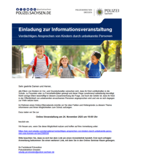 die Polzei Sachsen lädt zu einer digitalen Informationsveranstaltung am 24.11.25 um 19.00 Uhr zum Thema "verdächtiges Ansprechen durch Fremde" ein. Nähere Informationen finden Sie hier.