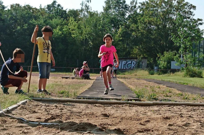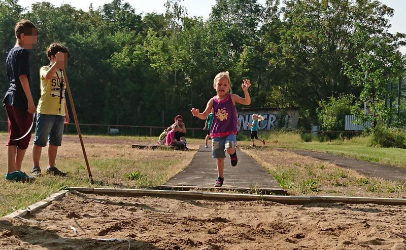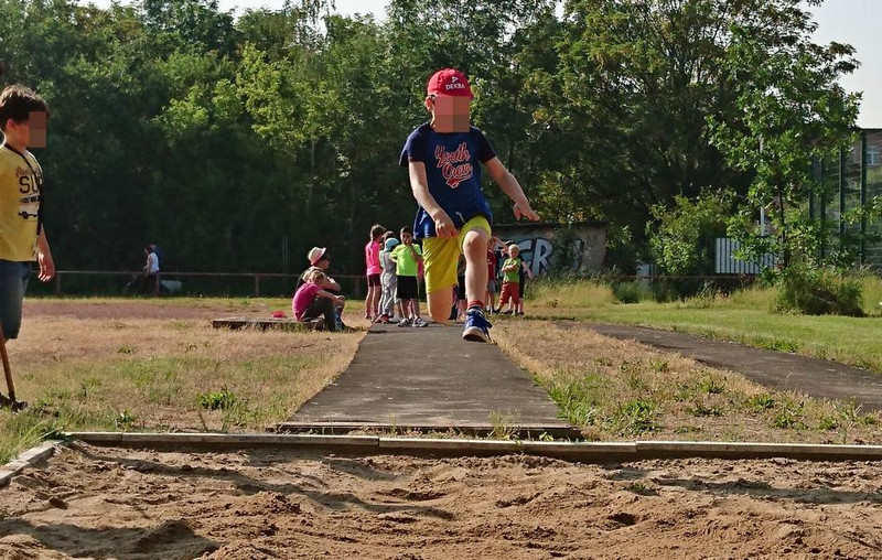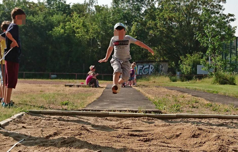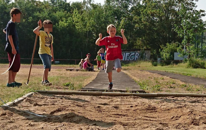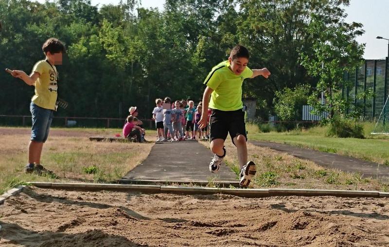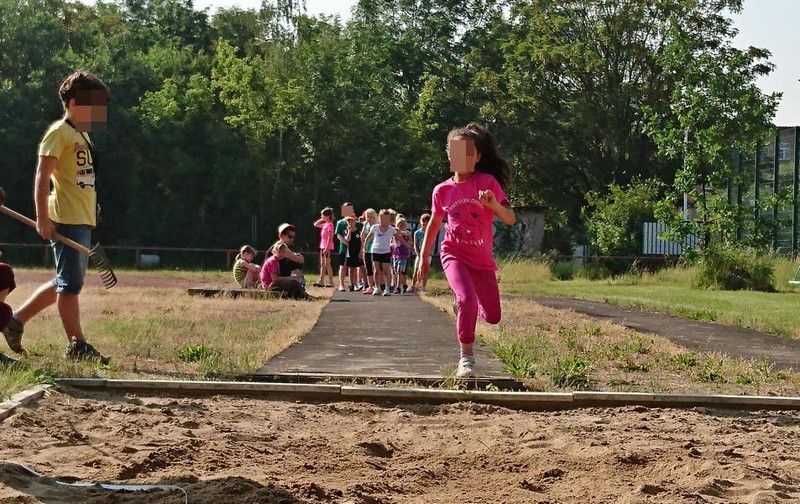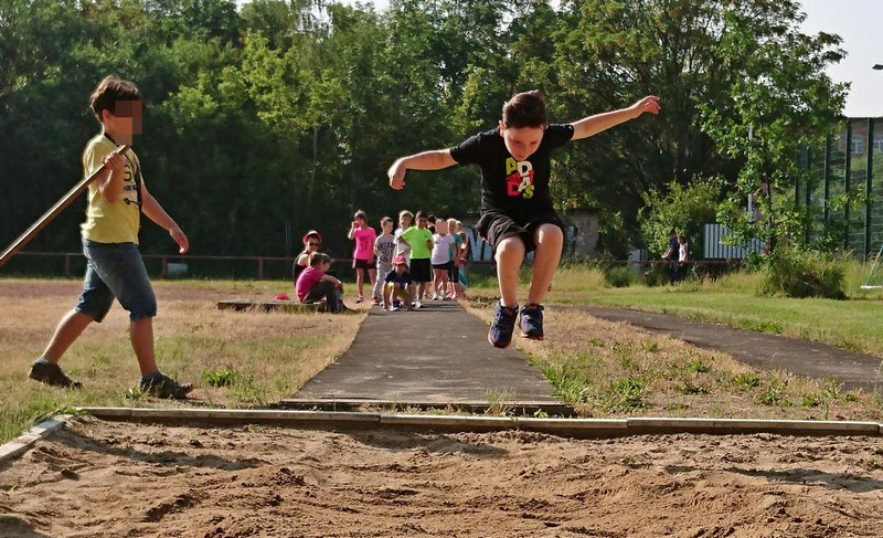 Nach der Begrüßung, dem Entfachen des "olympischen Feuers", dem Vortragen des olympischen Gedankens und der Erwärmung ging es dann für uns los mit Weitsprung. Hier erzielten wir viele super Weiten! Sehen wir nicht super sportlich aus? ;-)