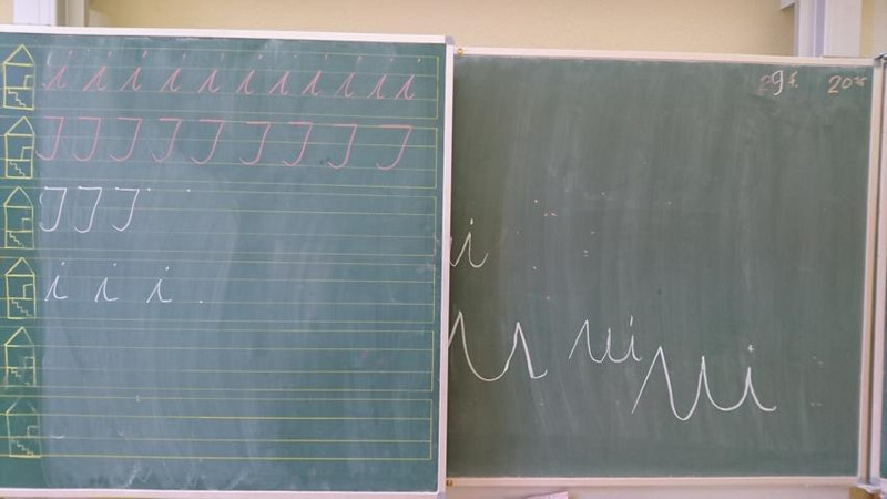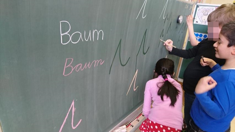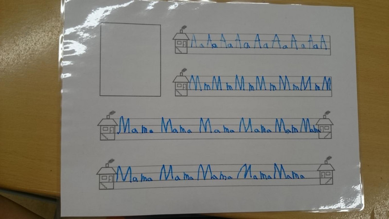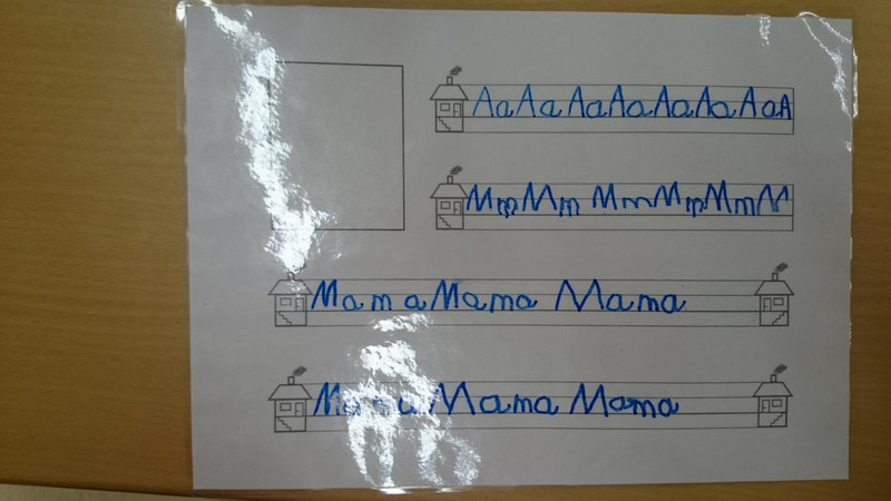 Seit Kurzem erlaubt uns Frau Bregar sogar, mit Pinseln und Wasser an die Tafel zu schreiben (JUCHU!). Das macht nicht so viel Dreck wie mit Kreide, sagte Sie. Es entstand auch das erste eigene geschriebene Wort "AMAIS".