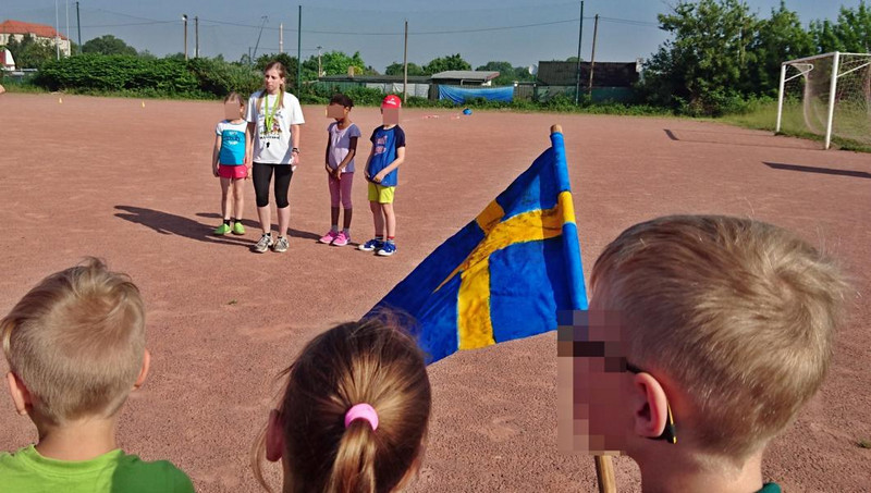 Jede Klasse zog im Vorfeld ein Land - wir erwischten "Schweden", was besonders Frau Bregar freute. Mit einer selbstgemachten Schweden-Flagge marschierten wir kurz nach 8 Uhr zum Sportplatz und suchten uns dort ein Plätzchen, an dem wir unser "Lager" aufschlagen konnten.