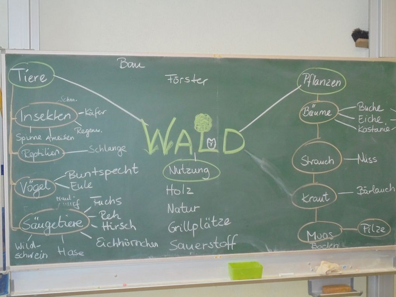 Seit heute beschäftigen wir uns im Fach Sachunterricht mit dem Thema "Wald". Gemeinsam entwickelten wir an der Tafel ein Gedankenlandkarte. Frau Neise sammelte alles, was uns spontan eingefallen war an der Tafel und wir verbanden die Gedanken zum Schluss noch sinnvoll miteinander. In den nächsten Stunden werden wir noch viel über den Aufbau des Waldes, die Pflanzen und Tiere erfahren. Wir sind sehr neugierig.