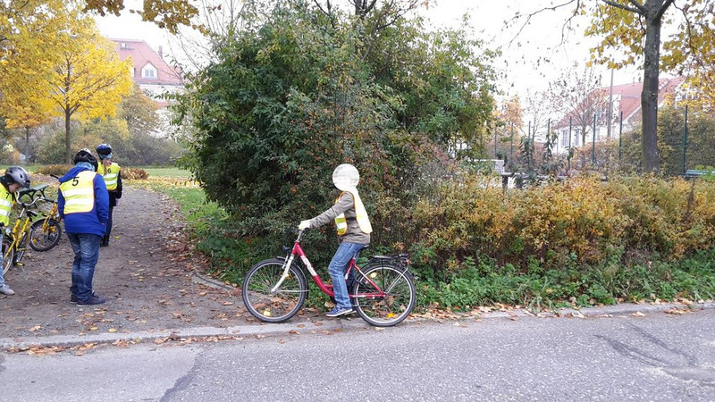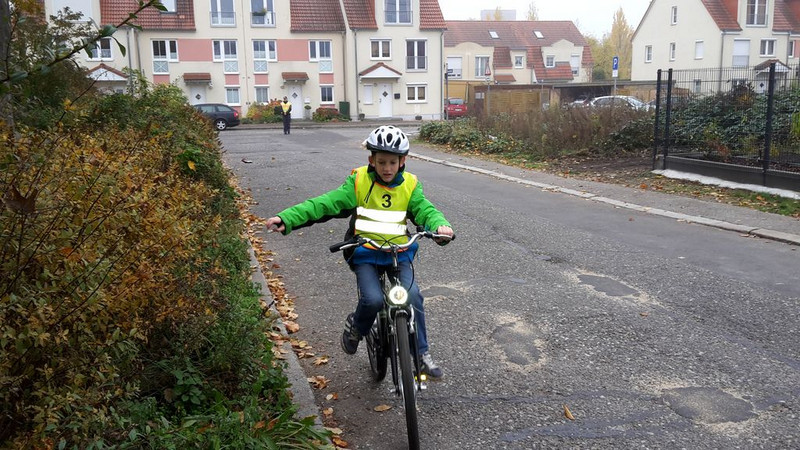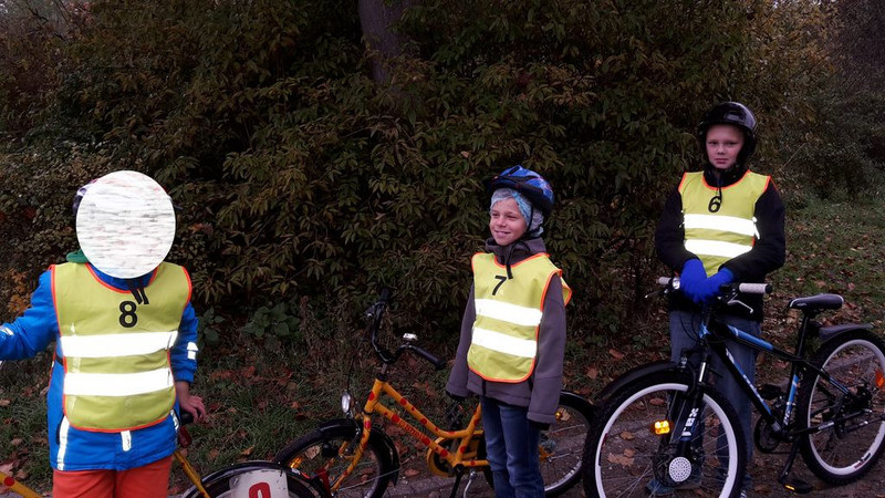 Zuerst musste jeder von uns auf dem Schulhof seine Fahrkünste vor zwei Polizeibeamten vorführen. Alle Kinder, die sicher anfahren und anhalten konnten, durften an den Übungen auf der Straße teilnehmen. Die anderen Kinder blieben in der Schule, weil die Polizisten das sicherer fanden.